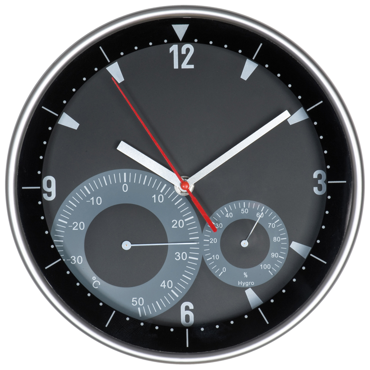 Стильные, настенные часы с чёрным циферблатом украсят каждую стену. Имеют термометр и гигрометр. Рекламный логотип предлагаем наносить на стекле.
