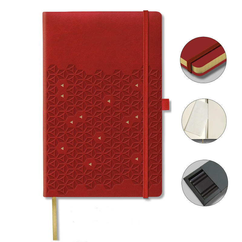 красный цвет обложки, геометрический дизайн с золотым тиснением, золотой срез